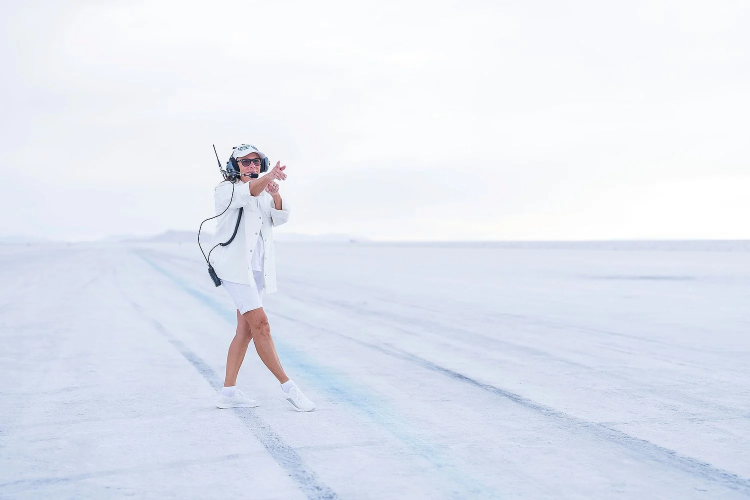 A woman in blue coveralls holding a yellow power drill, standing in a sterile, brightly lit industrial or laboratory corridor with blue floors and white walls.